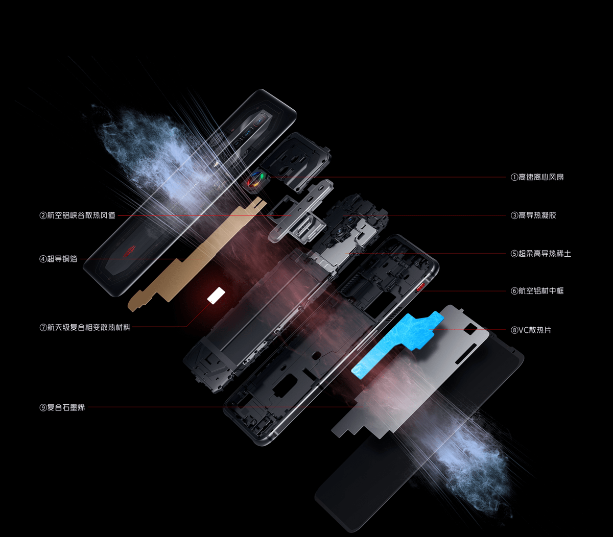 使用的是骁龙8+LPDDR5+UFS3.1经典性能三件套组合,不过性能对于游戏手机来说只是一部分,重要的是性能释放,红魔7依然搭载了那套ICE散热系统,除了大面积铜箔液冷、石墨烯等散热材料以外,还加入了红魔非常有特色的风冷散热系统,由高速离心风扇、特制风道和高导热硅脂组成,这让它拥有了普通的手机不可比拟的散热优势。