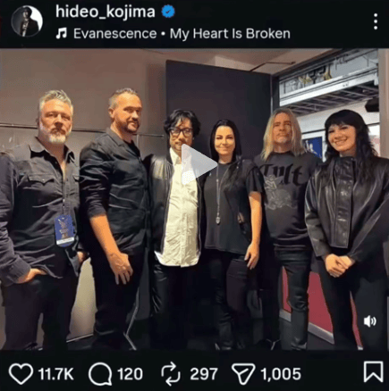 过了一会,他又发了条和摇滚乐队Evanescence合影的照片,我知道你可能没听过这个组合,但不重要,重要的还是配乐,选的是这个乐队的曲子《我心已碎》(My Heart is Broken)
