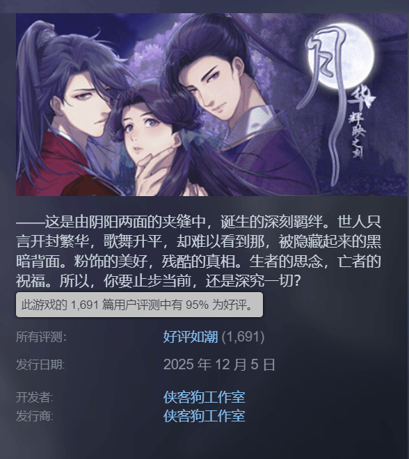 2025年几乎没有新的大厂女性向游戏上线,不过在“国乙单机”这个冷门的领域,倒是有几部值得关注的作品。年末上线的《月华辉映之刻》,算是我心中的国产独立乙游黑马。