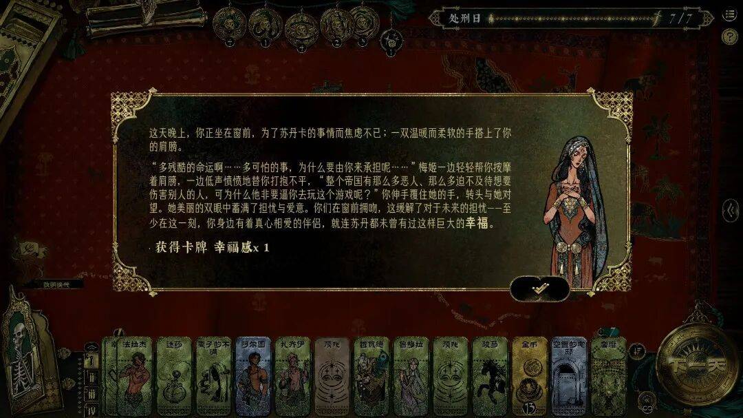 我很喜欢用打牌来讲故事的游戏,当角色、物品乃至思绪都变成卡牌,叙事要素抽象为手中可调配的资源,更带来编织故事的快乐。自打《密教模拟器》之后,我尝试过不少类似跑团桌游的游戏,在刚上手《苏丹的游戏》时也忍不住做了一下对比。